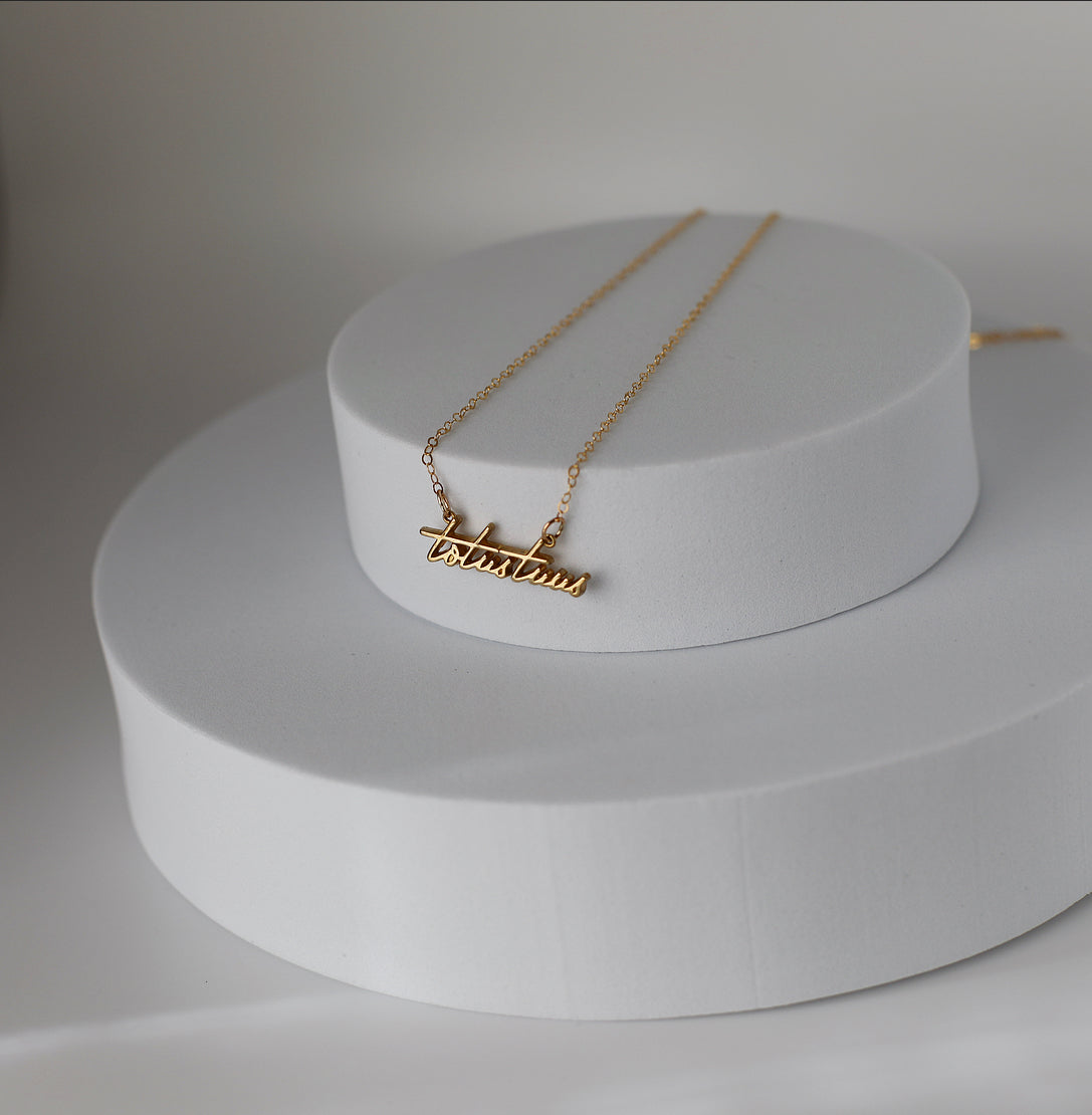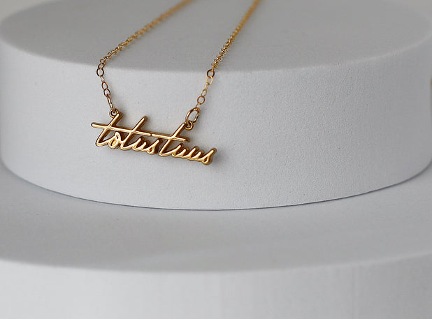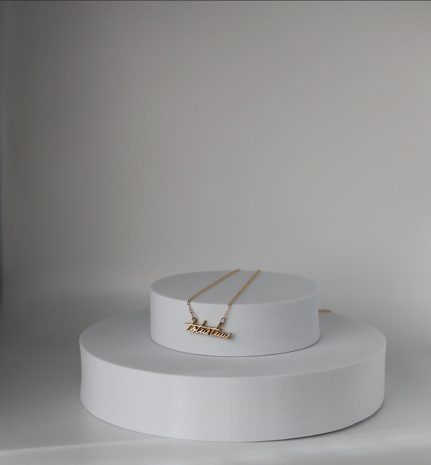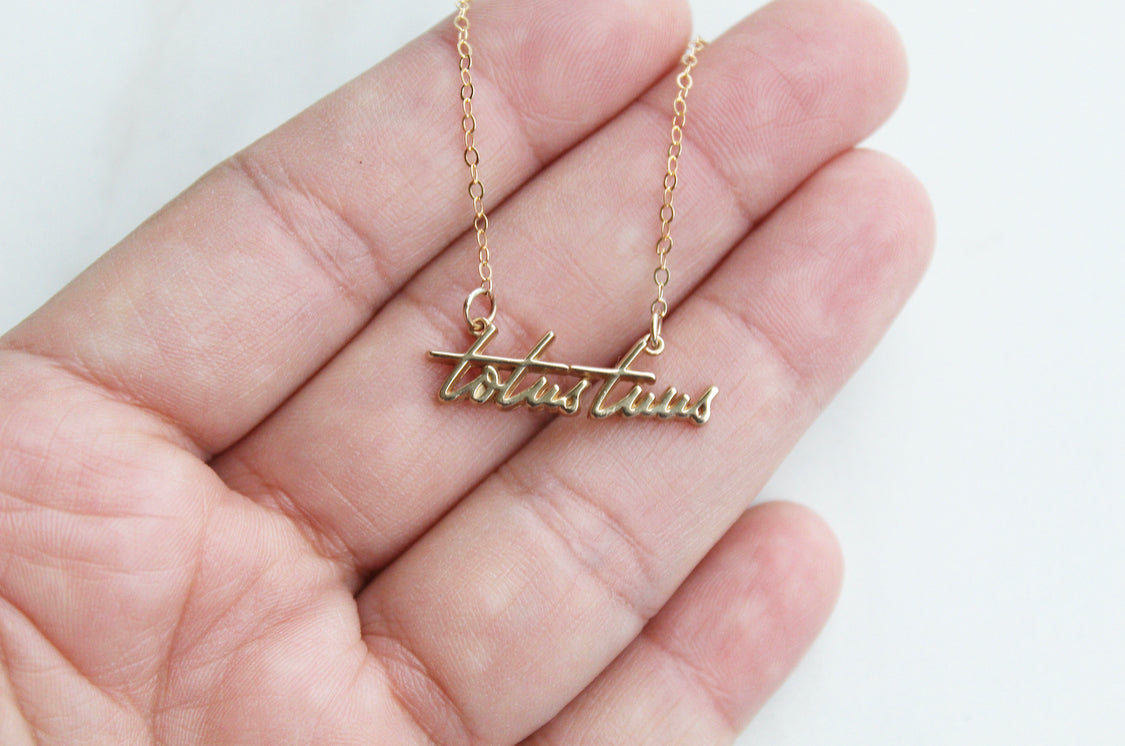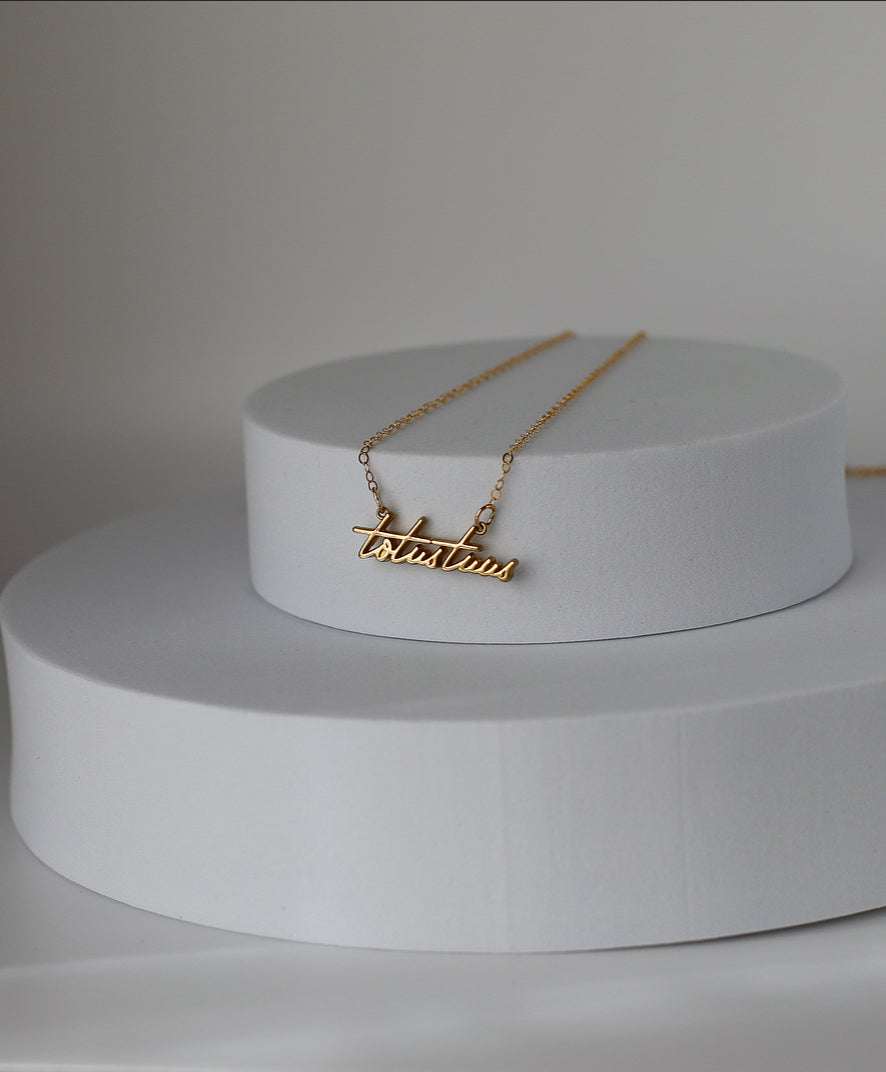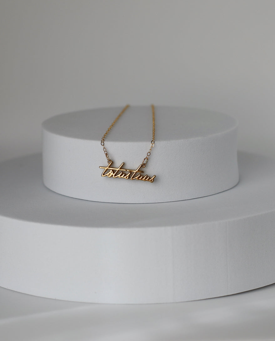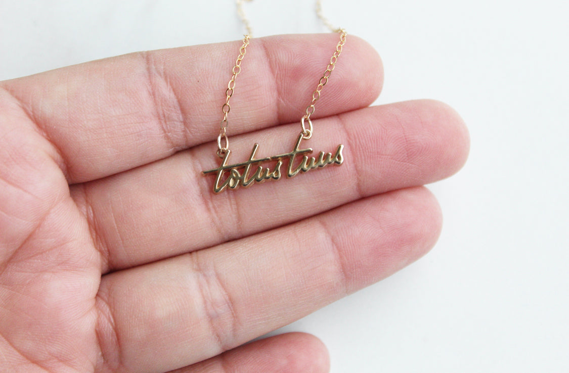 The Totus Tuus Medallion necklace is a simple yet elegant piece that embodies the essence of faith. The medallion features a beautifully crafted script of the Latin phrase "Totus Tuus," which means "totally yours," a symbol of devotion and surrender to God.