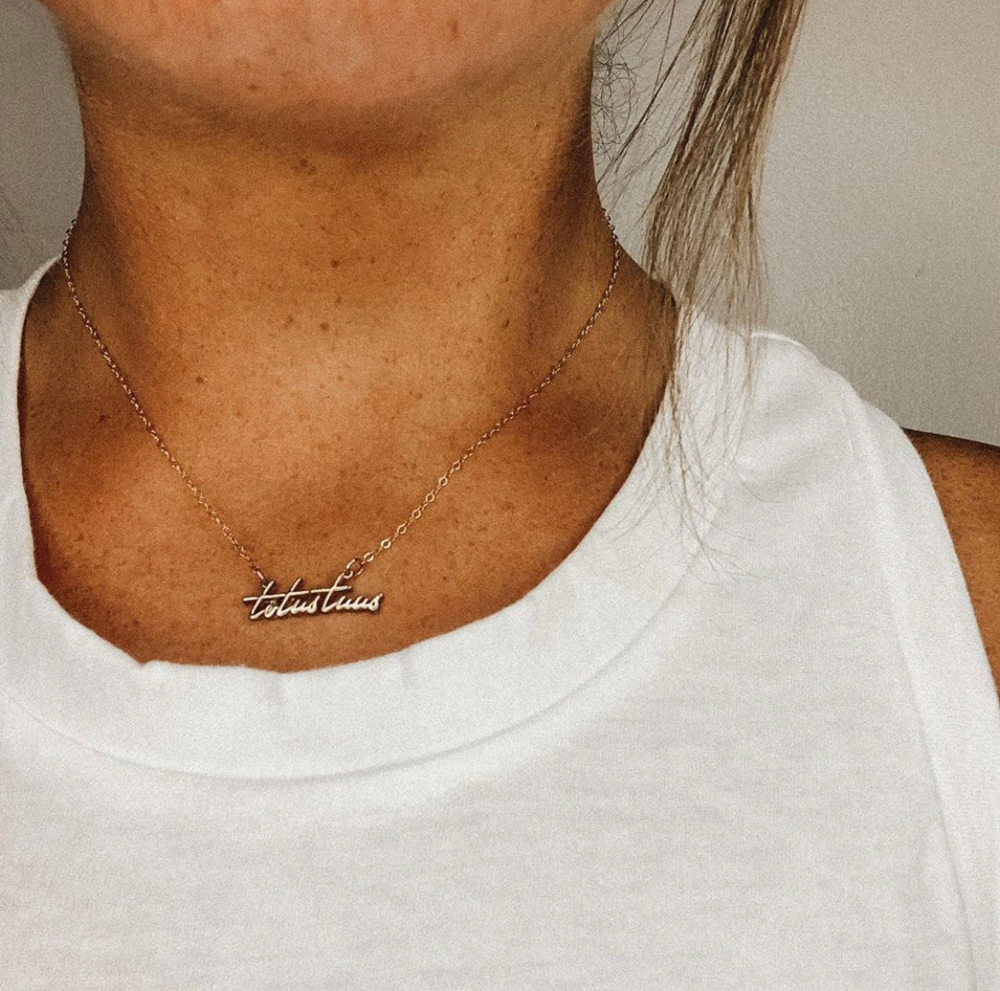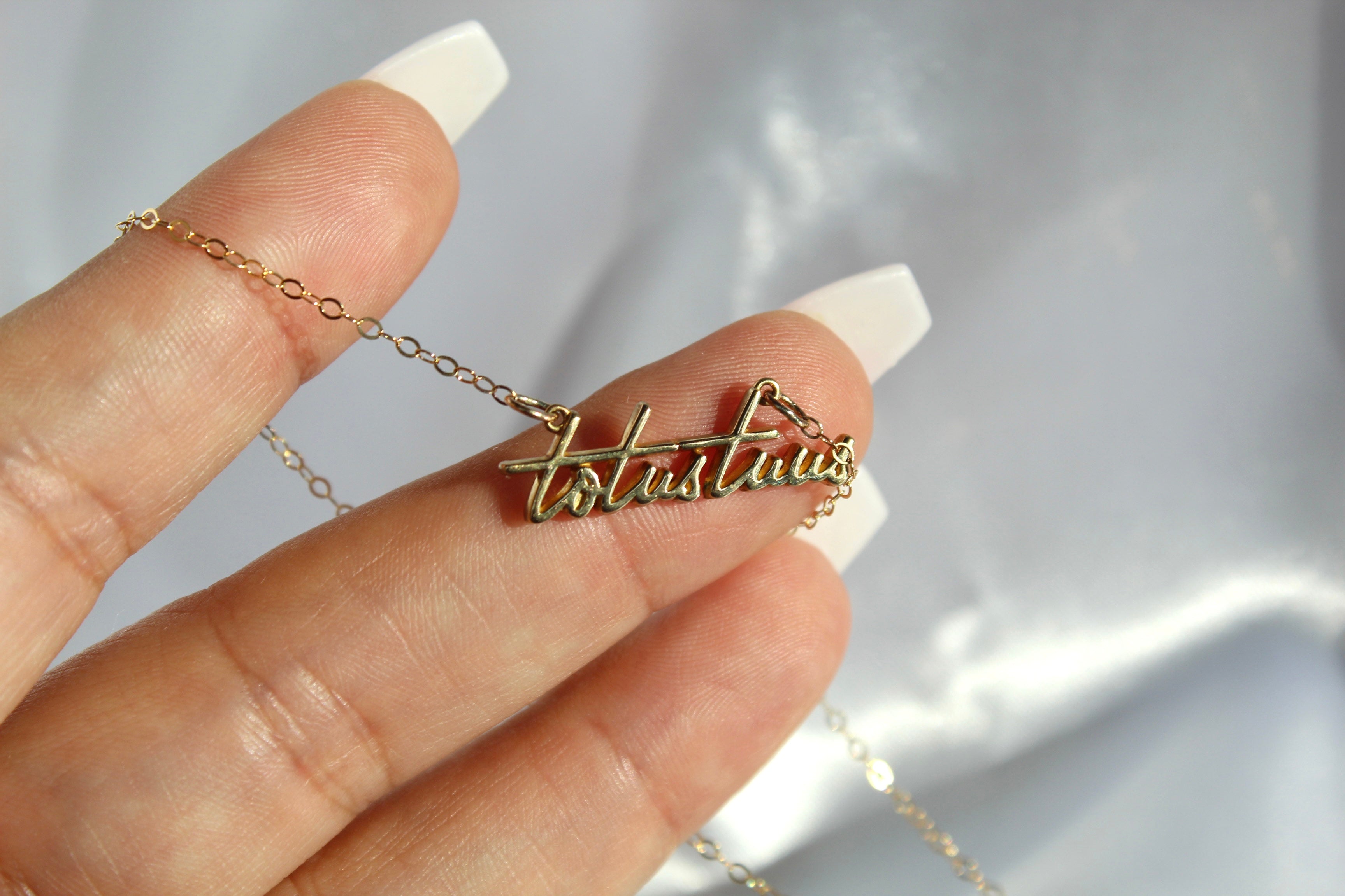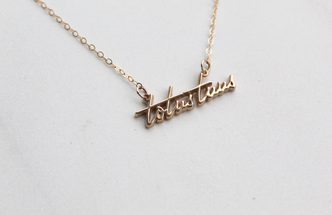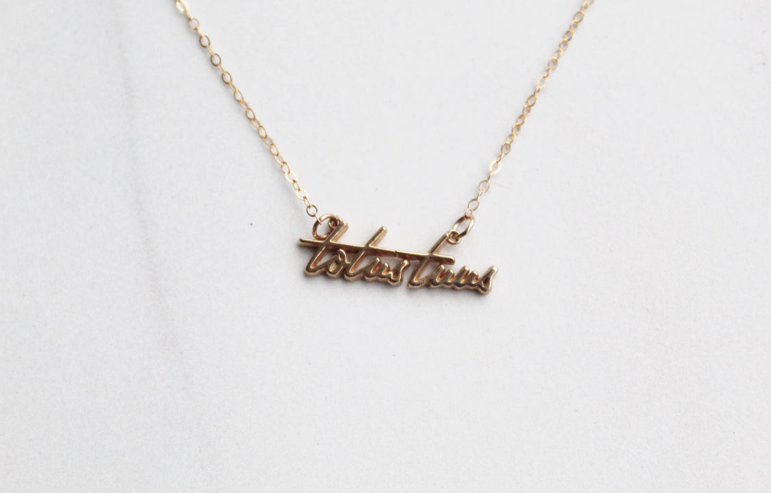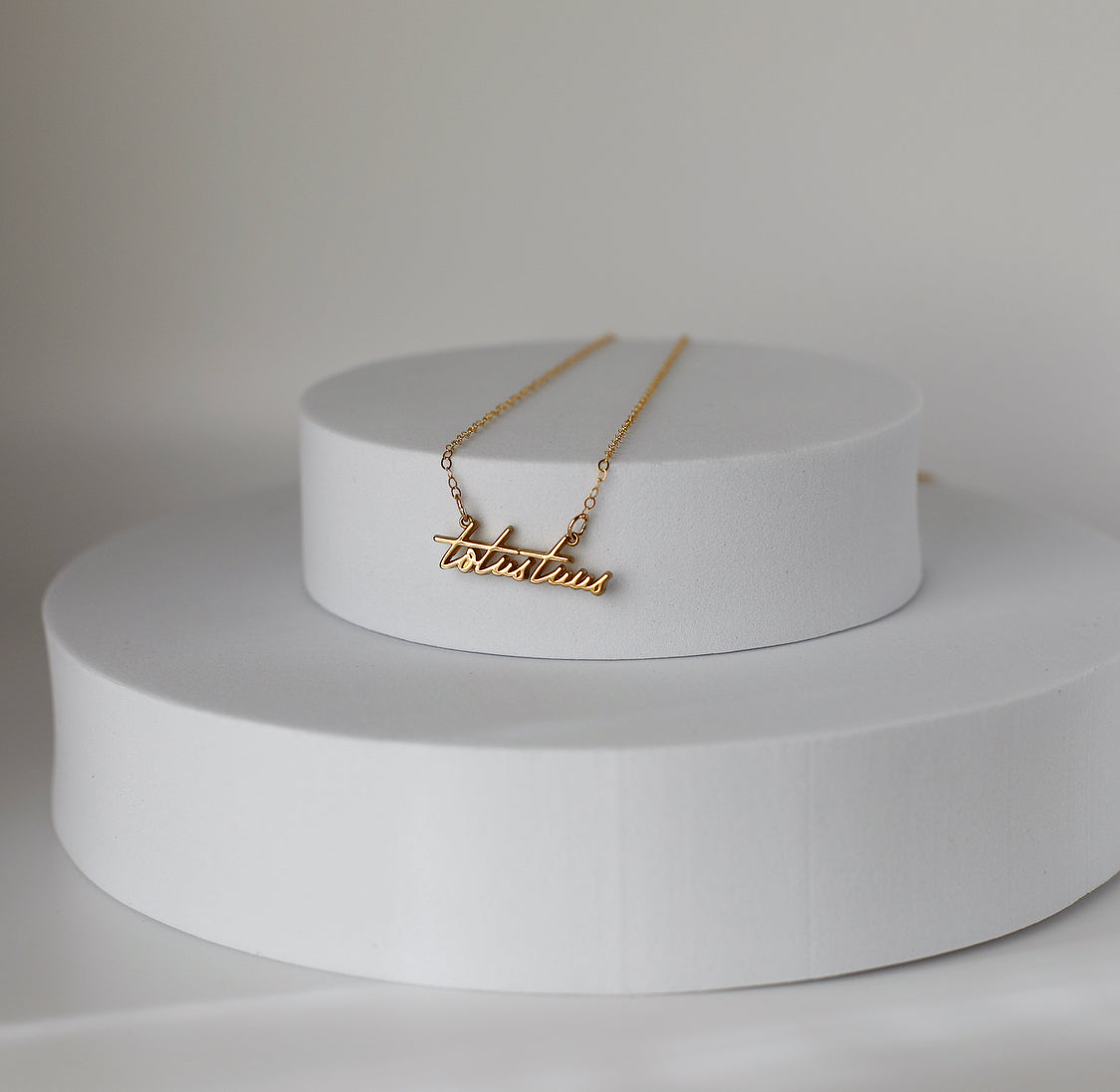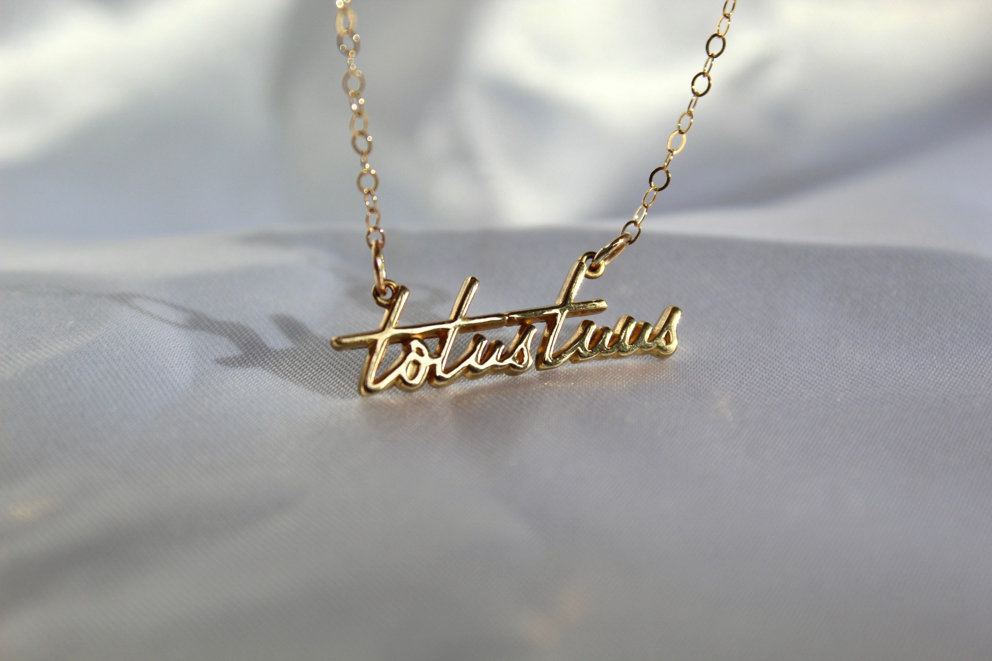 The Totus Tuus Medallion necklace is a simple yet elegant piece that embodies the essence of faith. The medallion features a beautifully crafted script of the Latin phrase "Totus Tuus," which means "totally yours," a symbol of devotion and surrender to God.
